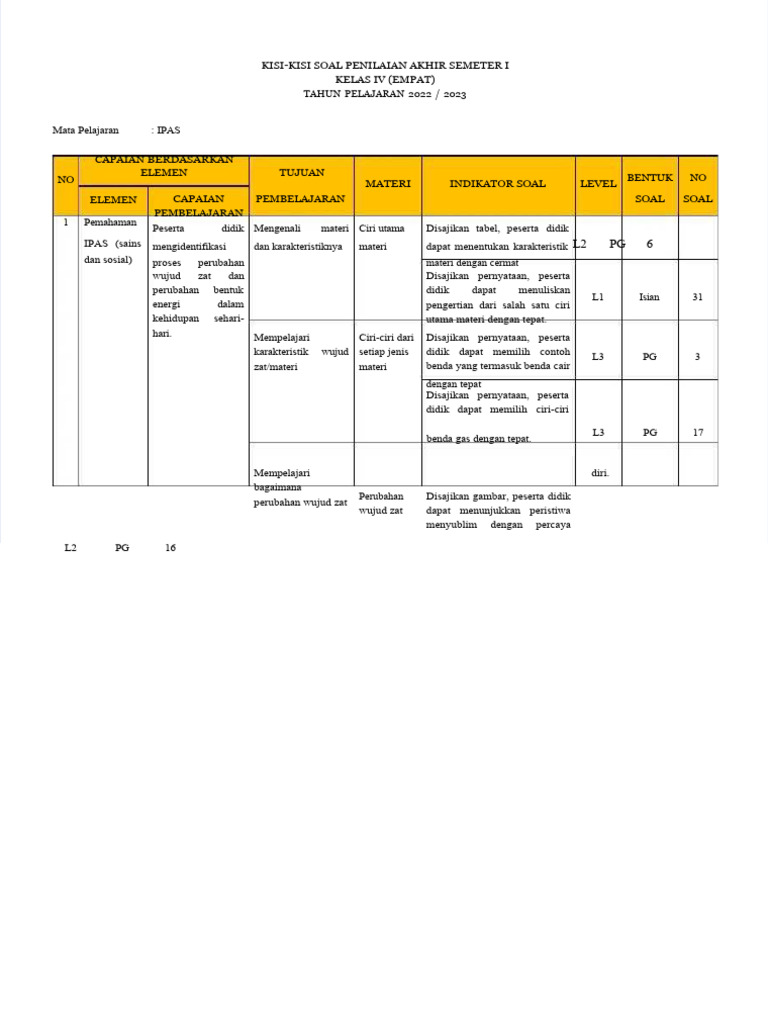 - Keselarasan dengan Tujuan Pembelajaran: Kurikulum IPA kelas 4 dirancang untuk mencapai tujuan pembelajaran tertentu, seperti pemahaman tentang bagian tumbuhan, siklus hidup hewan, sumber energi, atau perubahan wujud zat. Kisi-kisi berfungsi sebagai jembatan antara tujuan pembelajaran dan instrumen penilaian, memastikan bahwa soal-soal yang dibuat benar-benar mengukur pencapaian tujuan tersebut.